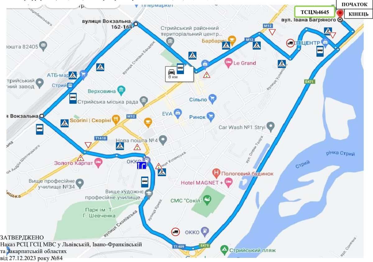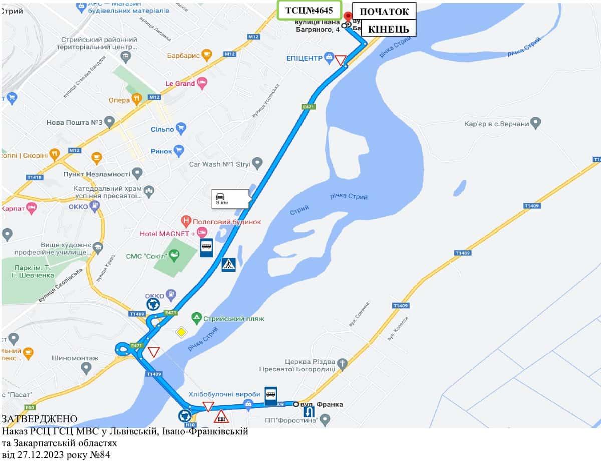 Маршрут №8 ТСЦ МВС № 4645. Для перевірки навичок керування ТЗ категорії B, BE, C1, C1E, C, CE, D1, D1E, D, DE.