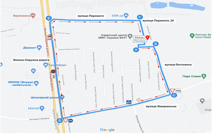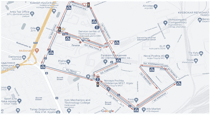 Маршрут №1 для перевірки навичок керування ТЗ категорії В, ВЕ, С1, С, СЕ, С1Е, D, D1 в ТСЦ №8042 РСЦ МВС в м.Києві